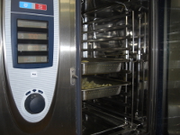 ホテルパンに具材を並べ、1台で煮る・焼く・蒸すが可能なスチームコンベクションオーブンで調理します。基本的に鍋、釜類は使用しません。食材の中心温度75℃で1分以上の加熱を行います。