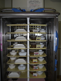 大型チルド庫に保存してある調理品をチルド状態で食事形態(常食・刻み・ミキサー等)、温めるものと冷たいものを分け、トレーに盛り付け、再加熱カートにセットします。